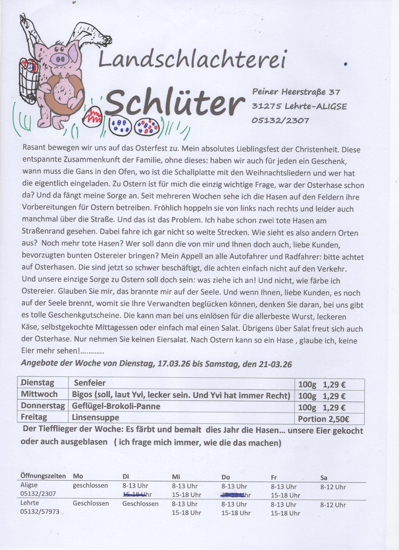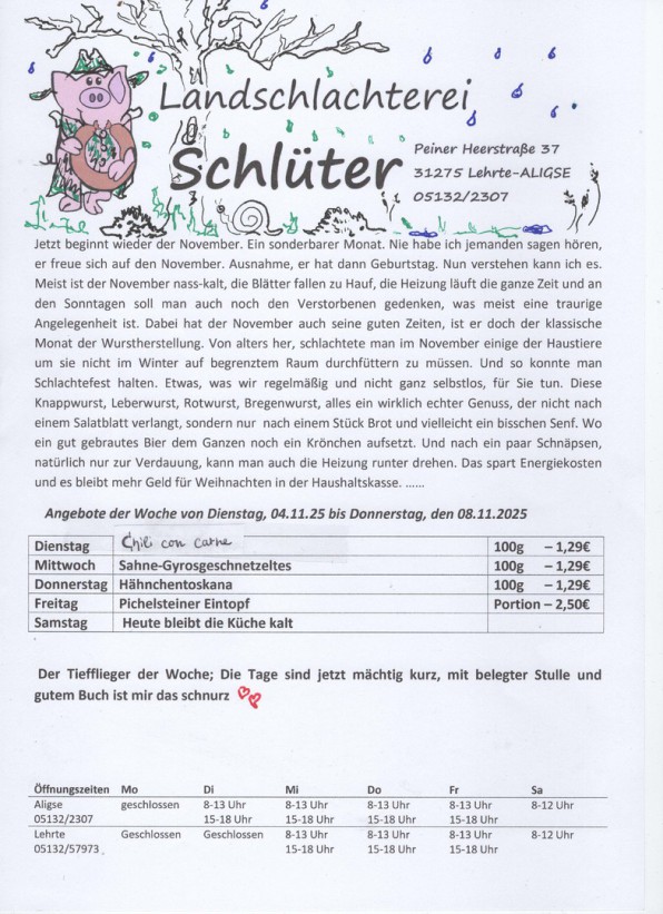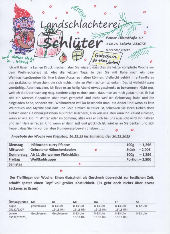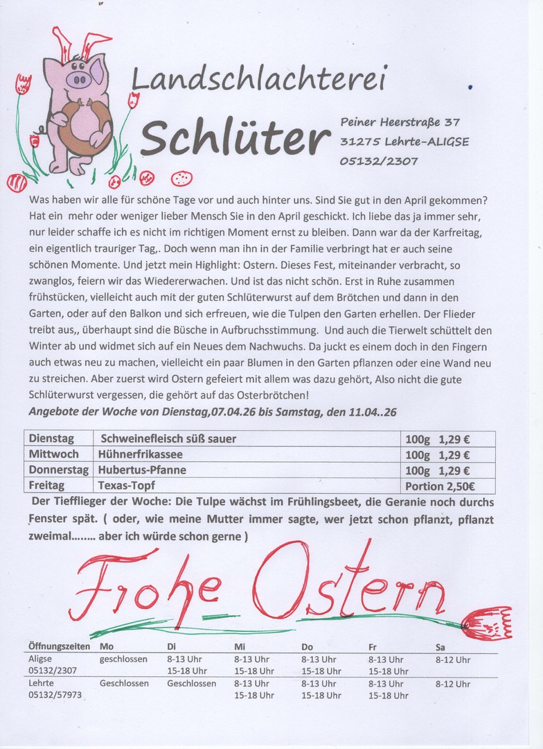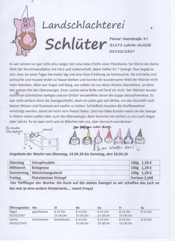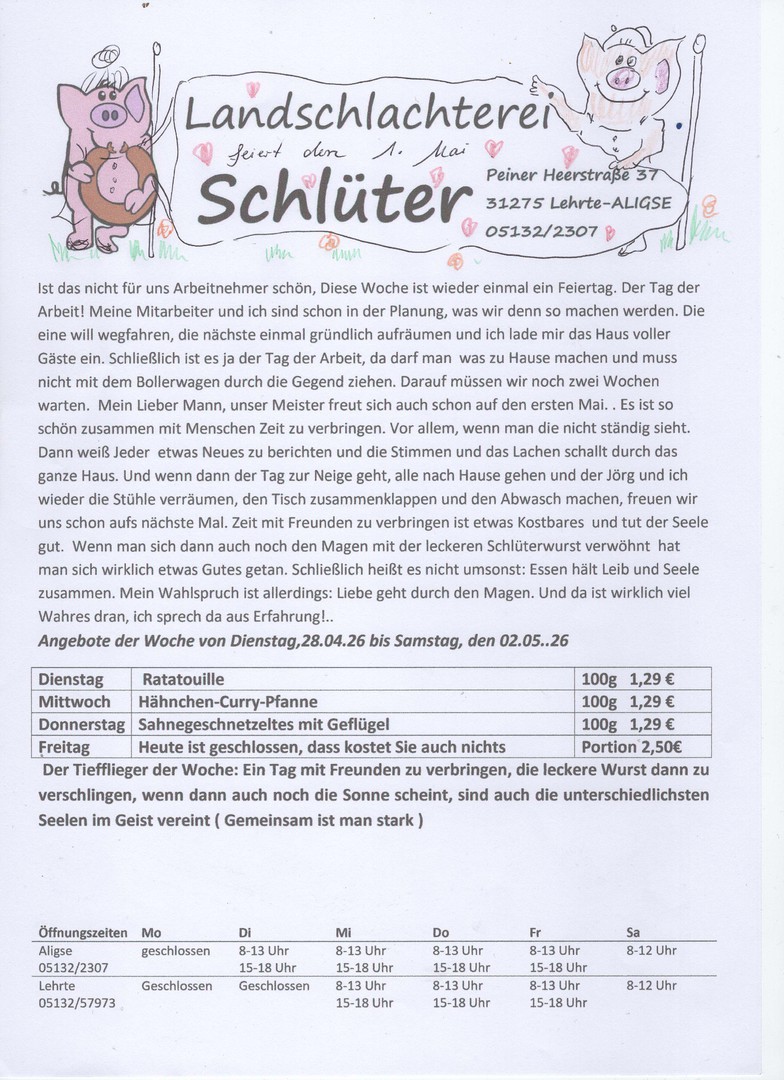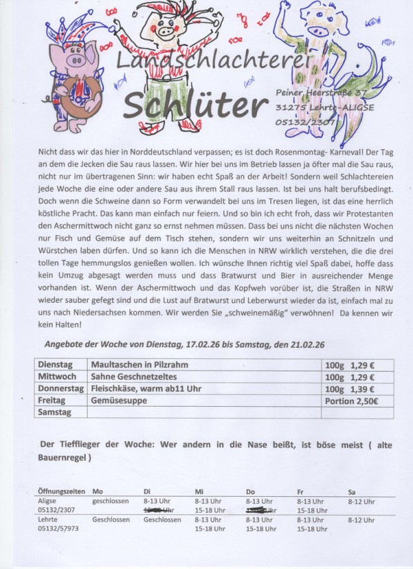 Jeden Freitag erhalten Sie bei uns im Laden den aktuellen Wochenplan für die kommende Woche, natürlich zum Mitnehmen.. Darauf finden Sie Anregungen und Ideen aus Ihrer Fleischerei Schlüter. Alle Waren werden appetitlich verpackt, damit Sie es gut mit nach Hause nehmen können. Dort kann es dann in Ruhe und mit Genuss verzehrt werden. Natürlich beraten wir Sie gerne, wenn es um Fragen der Zubereitung geht.. Manchmal taucht doch die eine oder andere Frage auf und wir haben immer ein freundliches Wort für Sie.